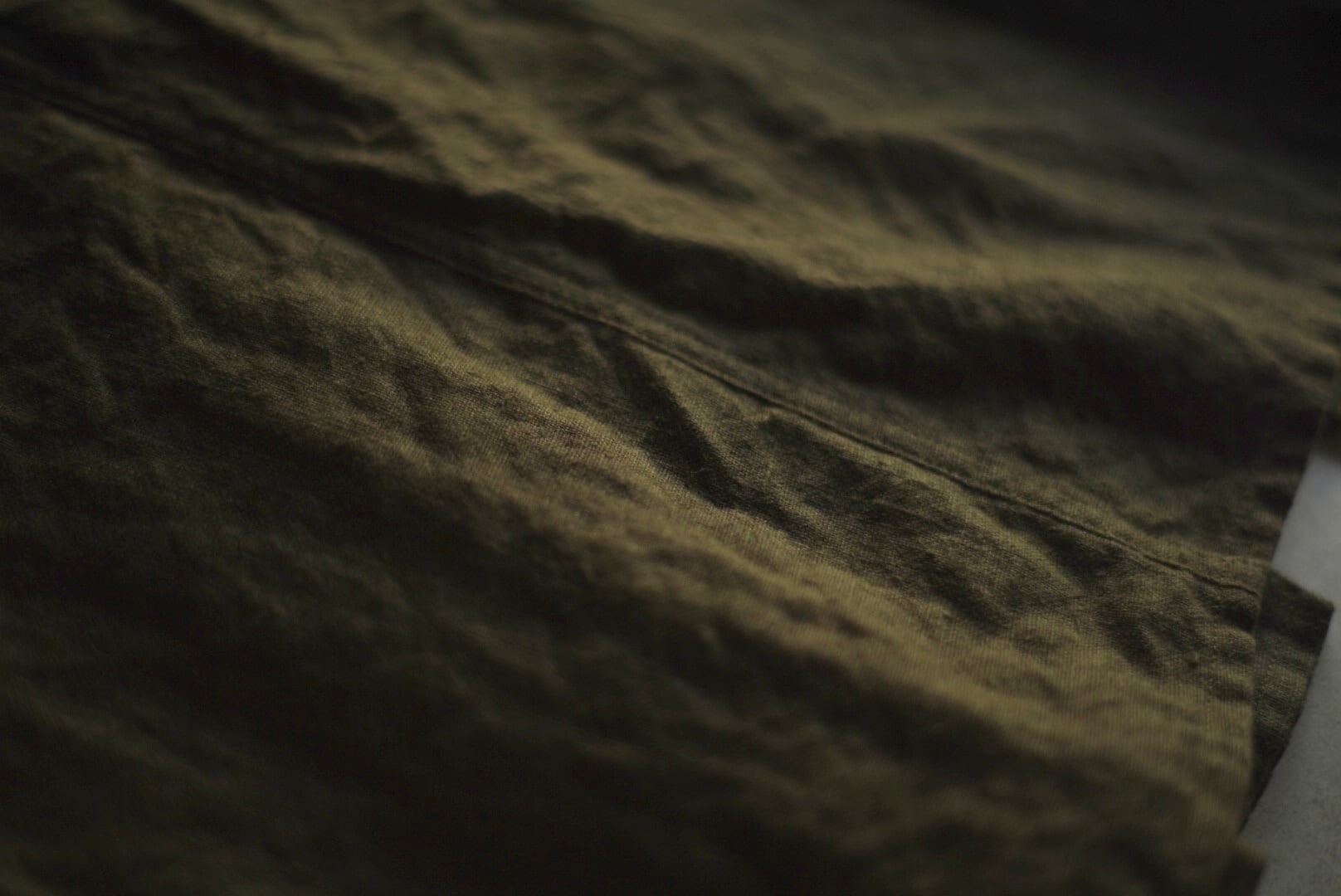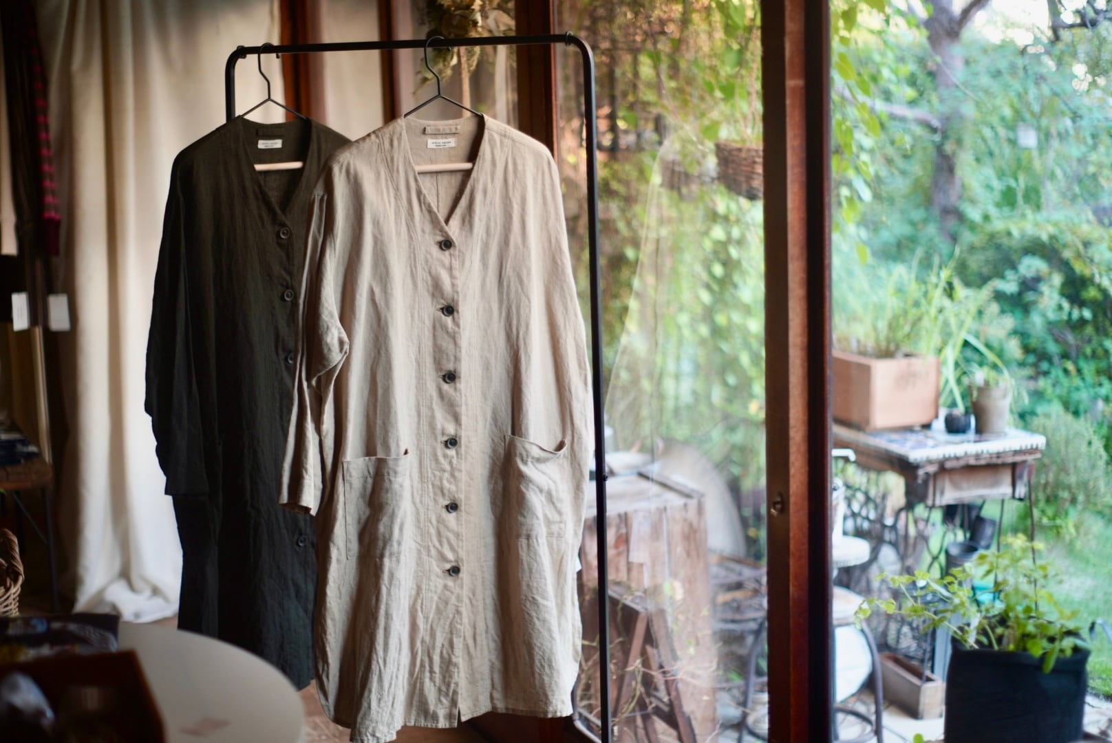 “使える” 麻素材のロングシャツです。ボタンは留めたり、外したり。