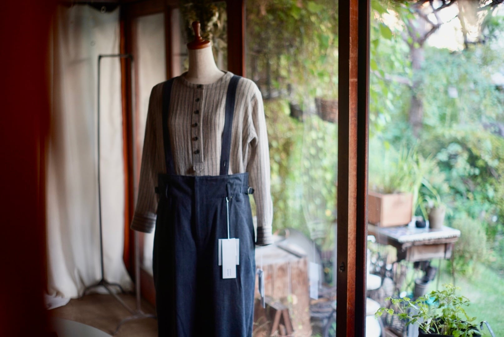 カツラギコットンでつくった、ゆったりとしたシルエットのサスペンダーパンツです。