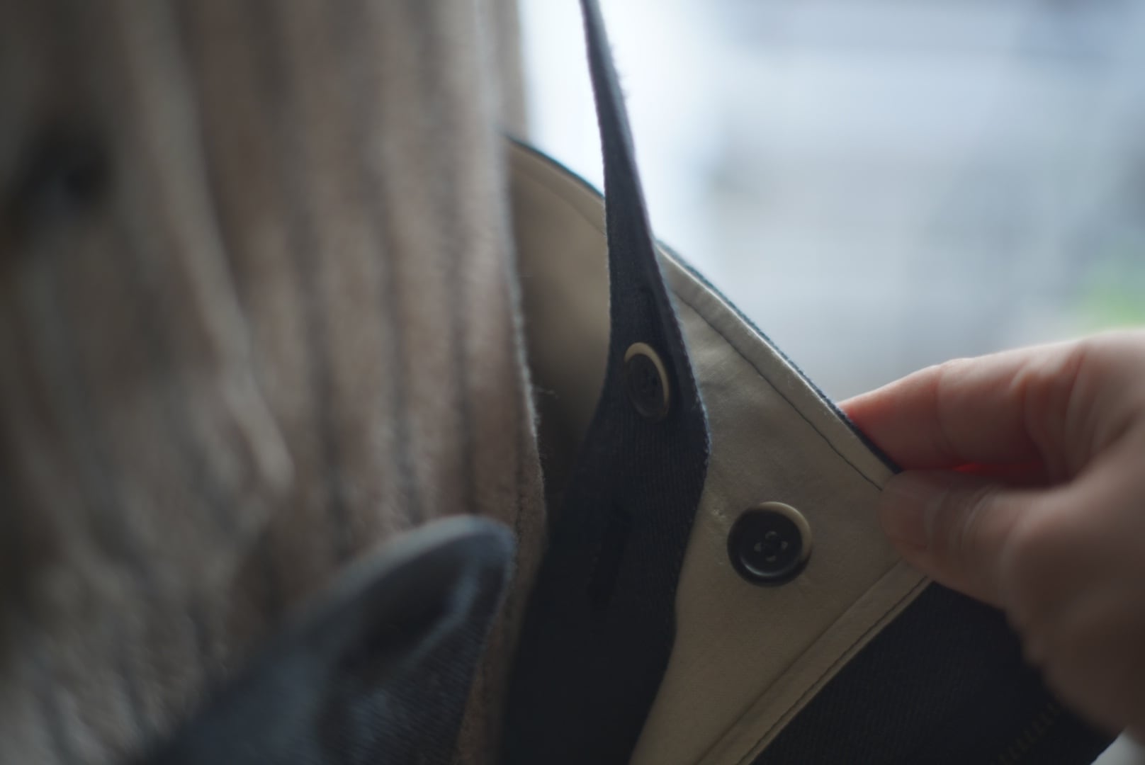片面顔料コーティングした生地を使用しているため、裾を折り返したときなど、