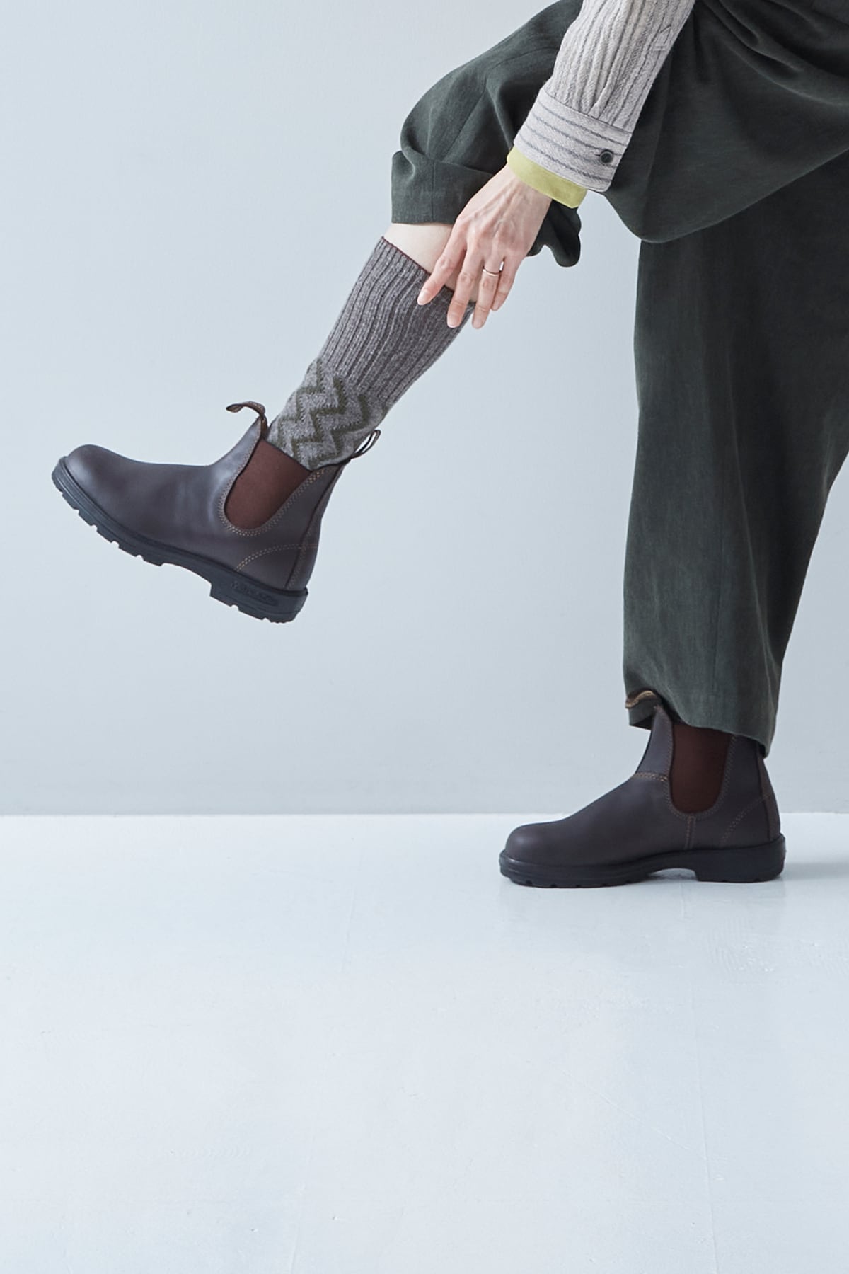 ・使用しているウール糸は、8番手の太糸。ソックスの厚みを生むローゲージで編んだ、保温性に優れるあたたかな一足に仕立てています