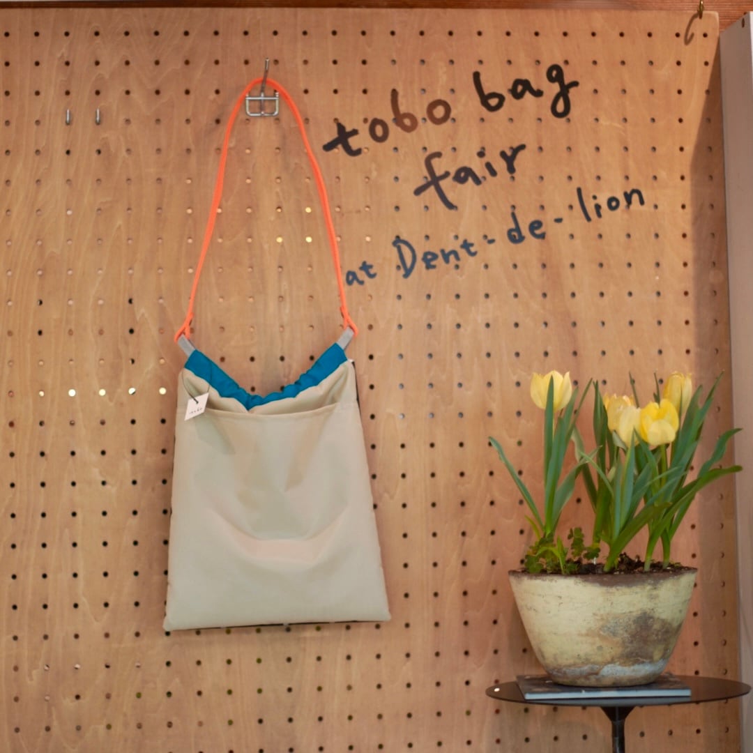 今回のtobo bag fairに是非作っていただきたい!と私からリクエストさせていただきましたバックです。Dent-de-lionには、初めて並ぶ形です。巾着のようなデザインでショルダーで持つととっても可愛くて〜。ふらりとどこかお散歩に行きたくなる、そんな軽やかな気持ちになるバックです。