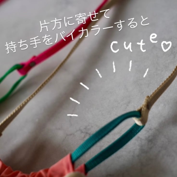 そのギャザーを片方に寄せて持ち手をバイカラーにして持っても可愛いですよ。