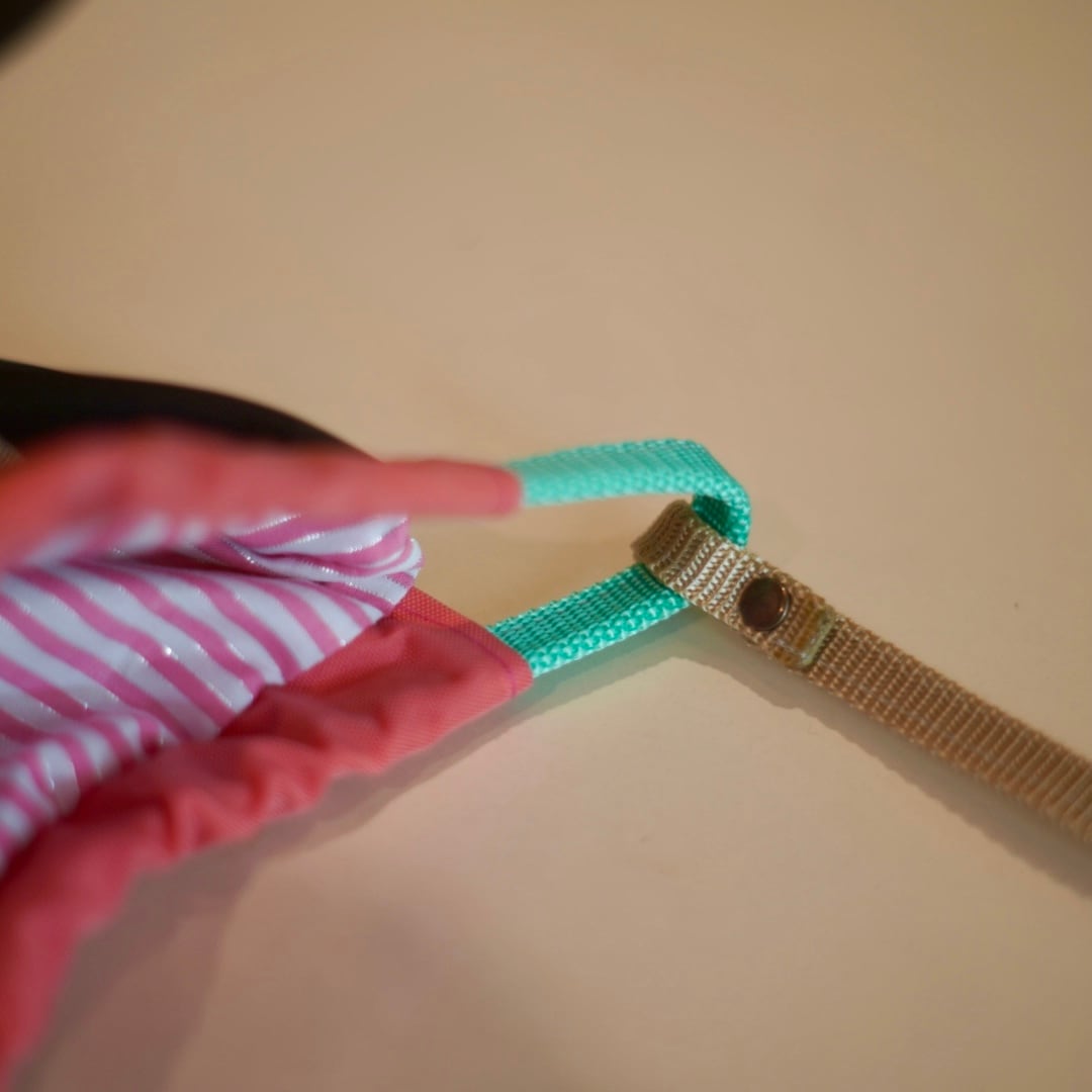 そのギャザーを片方に寄せて持ち手をバイカラーにして持っても可愛いですよ。