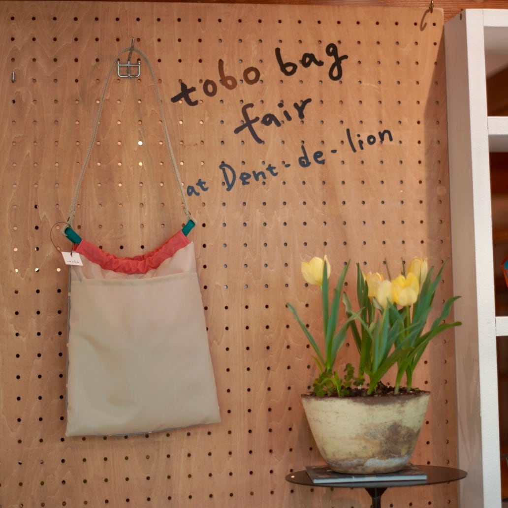 今回のtobo bag fairに是非作っていただきたい!と私からリクエストさせていただきましたバックです。Dent-de-lionには、初めて並ぶ形です。巾着のようなデザインでショルダーで持つととっても可愛くて〜。ふらりとどこかお散歩に行きたくなる、そんな軽やかな気持ちになるバックです。