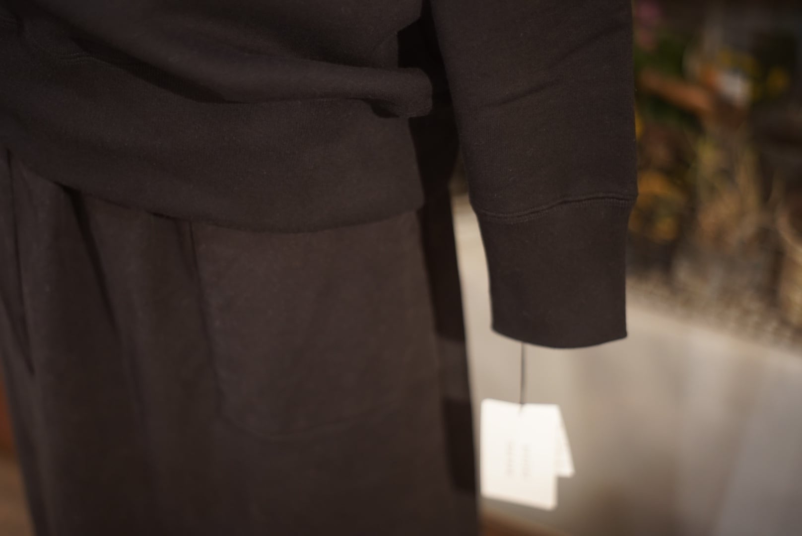 使用している布地は、和歌山にある旧式の編み機でつくった度詰めの裏毛スウェットです。ゆっくりと編み立てていくため、通常の編み機では表現できない膨らみとやわらかいタッチが生まれるのが特徴です。裏側は毛布のようなやわらかな起毛で、
