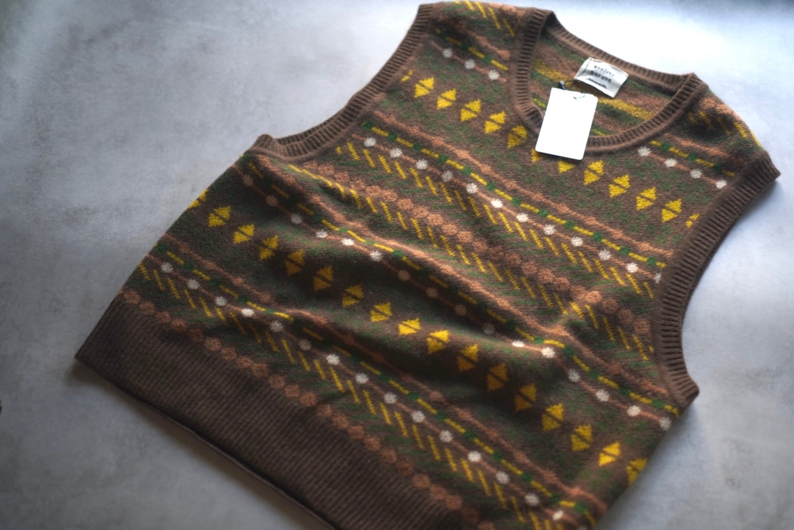 アトリエナルセ オリジナルの総柄図「ancient」のダブルジャガード編みでつくった、